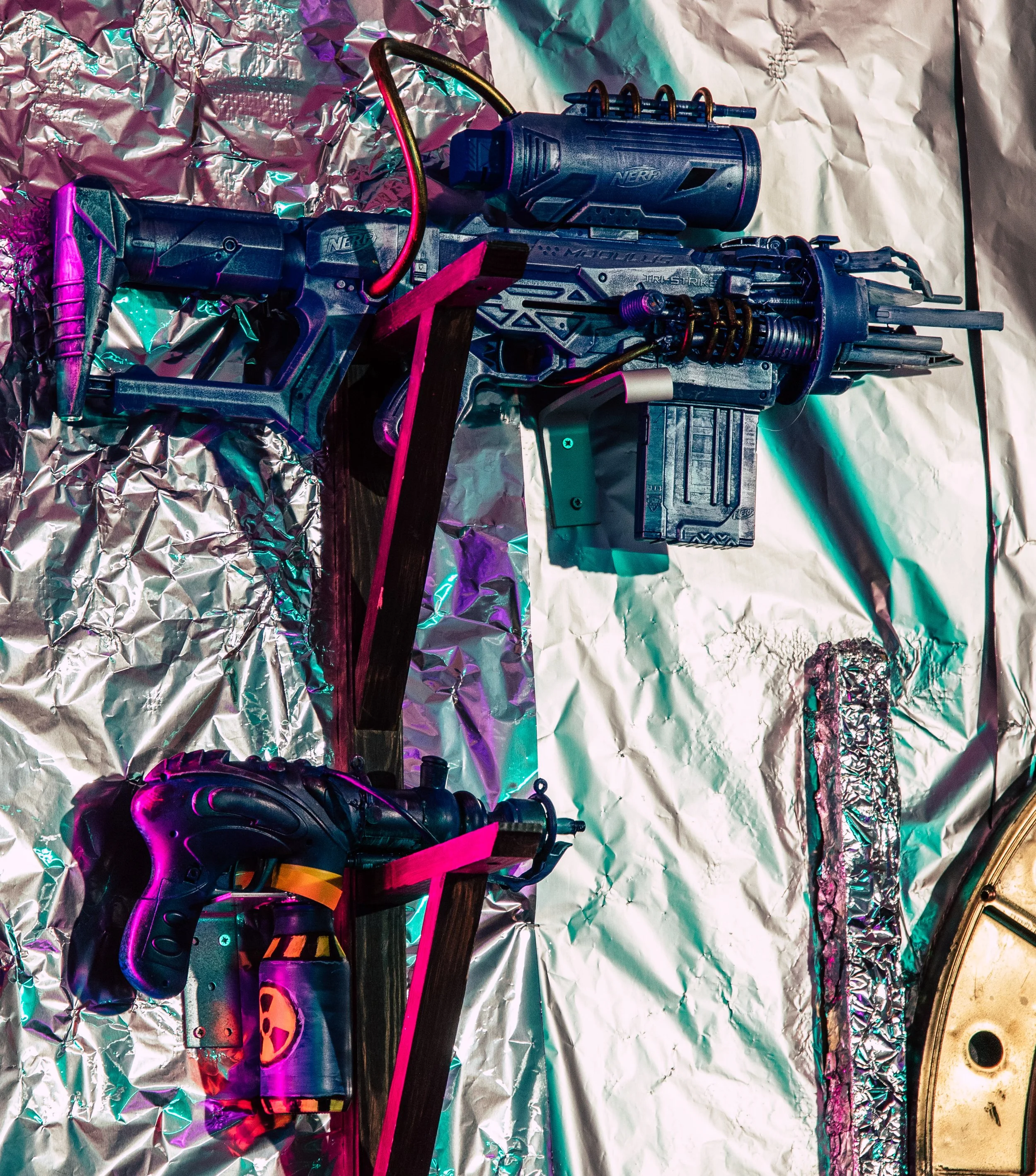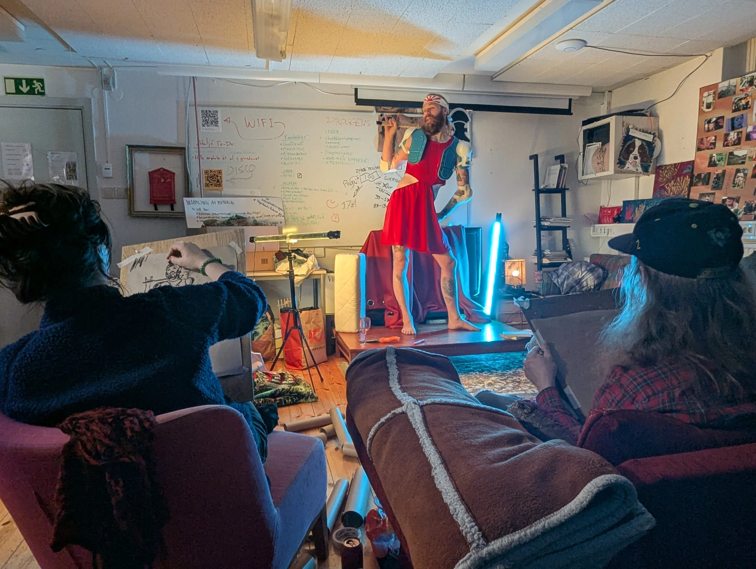 Superhjältedräkter, interiören till ett rymdskepp, laserpistoler, insidan av en hamnhangar, gammelsmink, fejkpenis, Änglagård med ombyta könsroller, med mera, med mera.